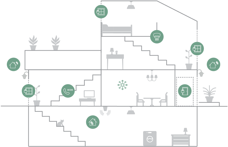 TensoLock vereint Rauchmelder, Tür- und Fenstersicherung, Aussen- und Innenalarm sowie einen Notrufsender in einer einzigen, hochmodernen elektronischen Alarmanlage.